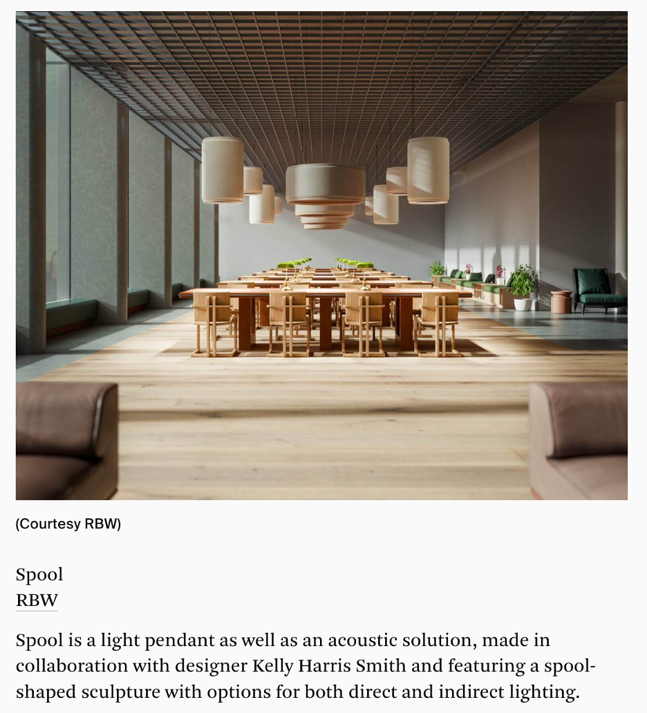 Spool is featured as the article’s primary photo, and shares, “Spool is a light pendant as well as an acoustic solution, made in collaboration with designer Kelly Harris Smith and featuring a spool-shaped sculpture with options for both direct and indirect lighting.”